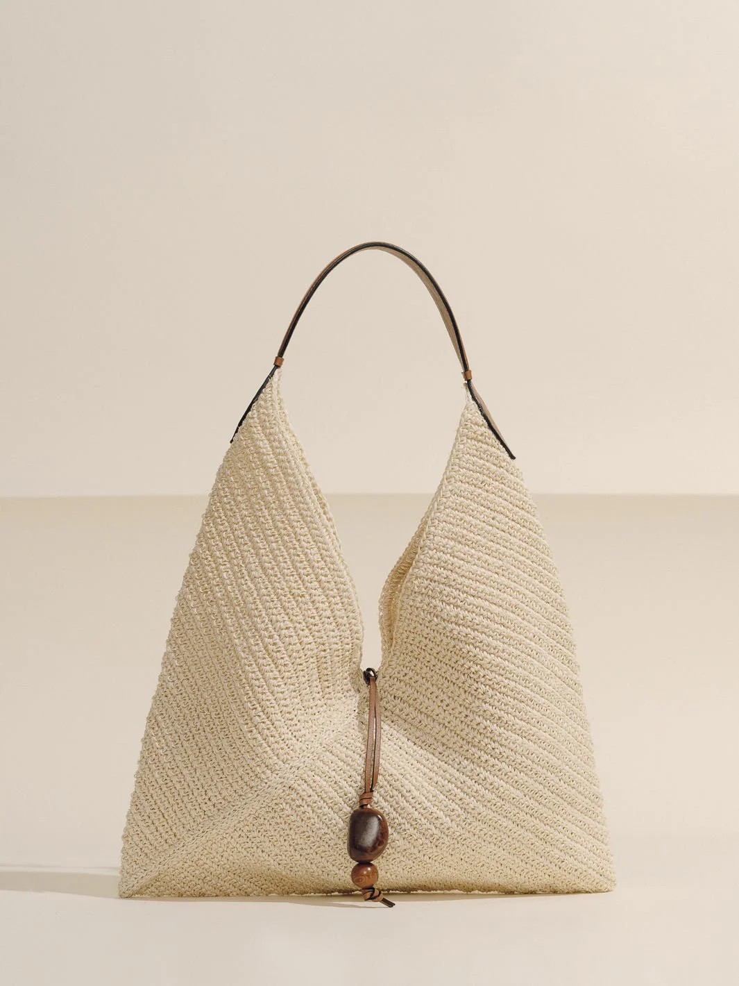 A delicate balance of form and function, its sculptural silhouette is complemented by a supple leather handle and a hand-carved tagua charm—an organic accent that nods to nature's quiet luxury. Perfectly packable, the Origami transitions seamlessly from beachside escapes to city strolls, embodying understated sophistication in every setting.